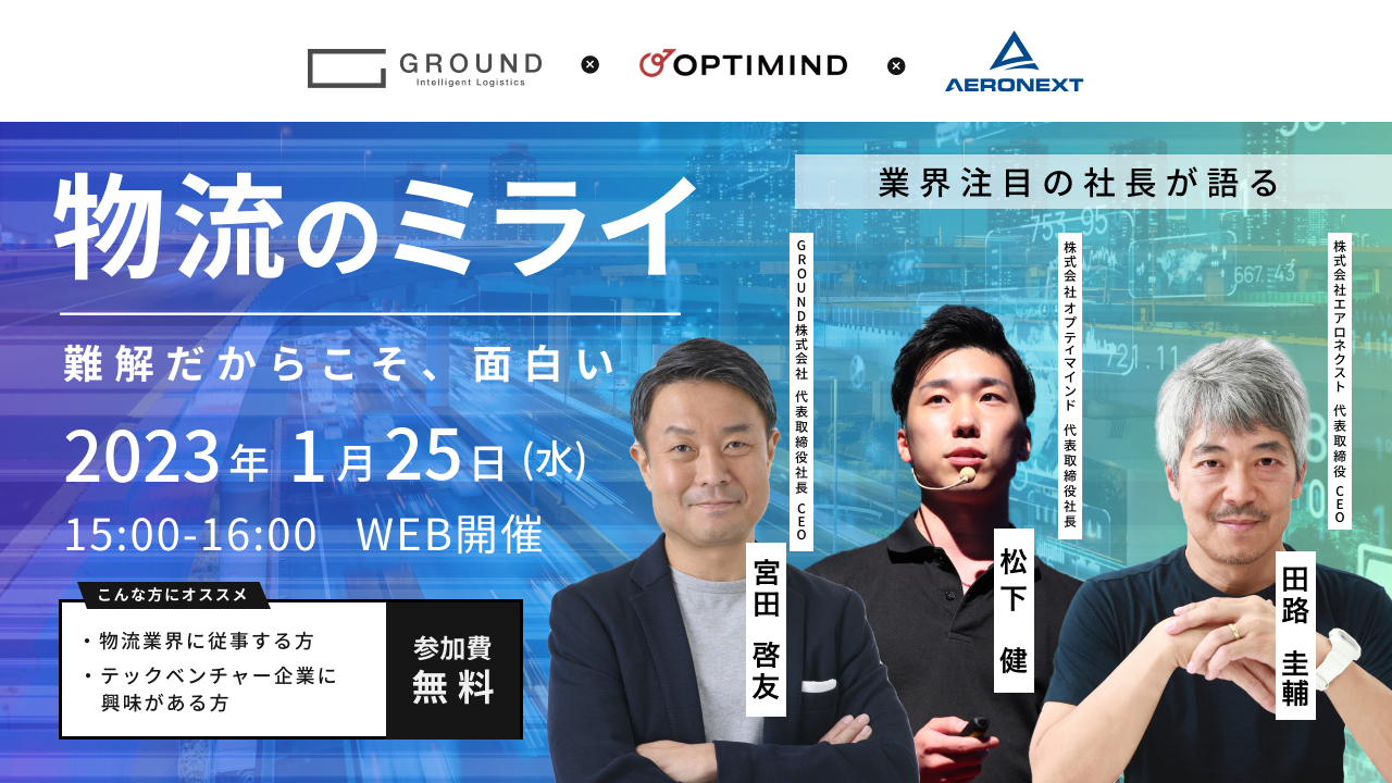 世界のラストワンマイルの最適化を目指すオプティマインド社が主催する本イベントでは、物流領域に技術で挑む3社の代表が集まり、その難しさとともに経営のやりがいや、今後の展望などをディスカッションします。